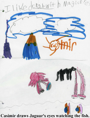 ![]() With Carol-Ann Hoyte, the capable and charming Quebec co-ordinator for Canadian Children's Book Week And on the right is another picture from Butler school, Casimir's drawing of Little Crab and Jaguar playing their magic eye-sailing game in the story "Little Crab and his Magic Eyes |